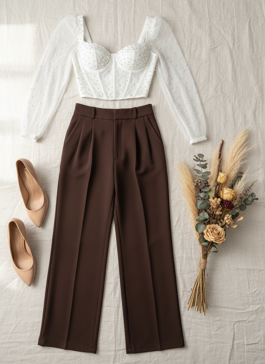 Hermoso set de 2 piezas blusa elegante tipo corset decorada con perlas, más pantalón formal palazo colores básicos